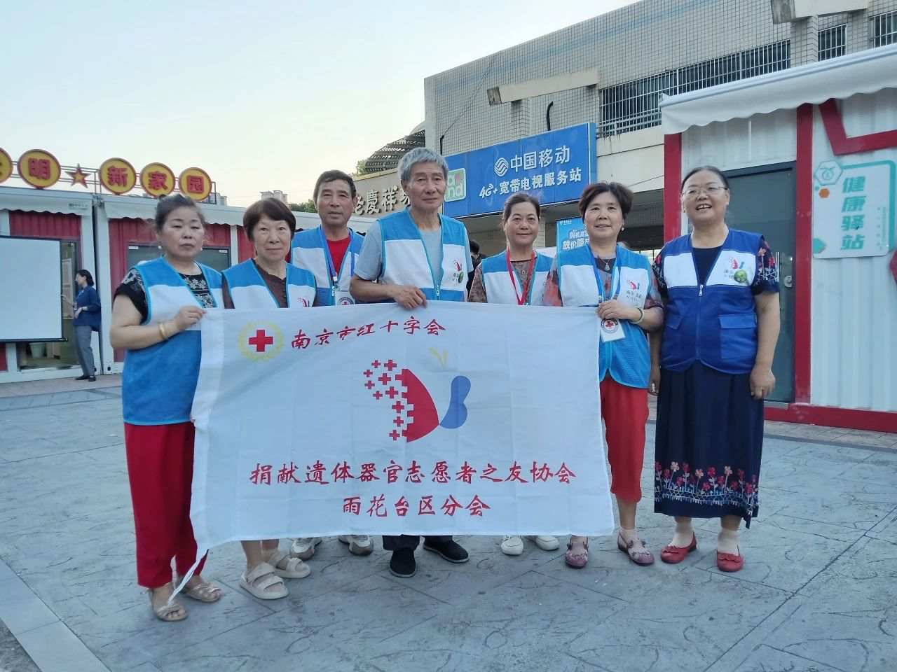 当天,景明家园组长徐淑琴得知社区将举办露天电影放映活动,居民聚集度高,便立即联系雨花台区捐友分会,提议借此契机开展“三献”宣传。消息一出,分会迅速响应,由秘书长刘家星带队,联合徐淑琴、陈起琴、孙丽珍、杨虎、黄书琴、朱利新等多位骨干组长,组成了一支热情洋溢的宣传队伍。
