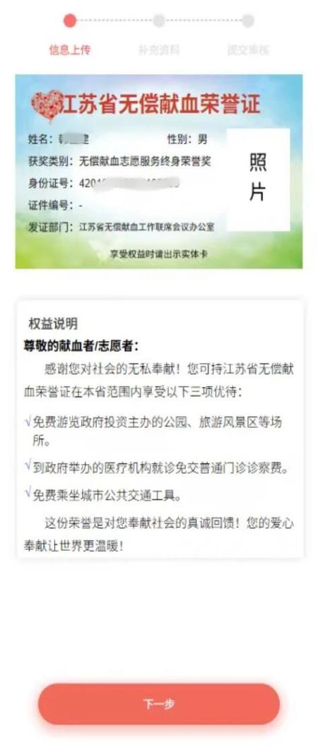 1.点击【江苏省内献血满4000mL】,点击下一步。