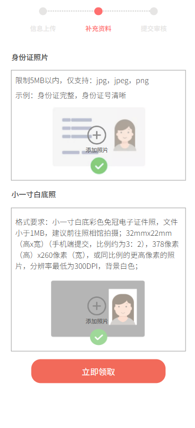2.上传身份证照片及小一寸白底证件照片,点击提交。上传信息成功后,等待工作人员审核。