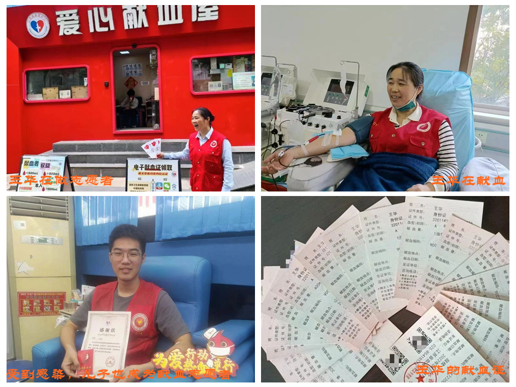 爱心需要互相感染、互相传递。现在,包括献全血和献血小板,王华的献血总次数已经达到22次,献血总量6400毫升,她还获得了2022—2023年度全国无偿献血奉献奖铜奖,加上丈夫和儿子,一家三口的献血量近万毫升。