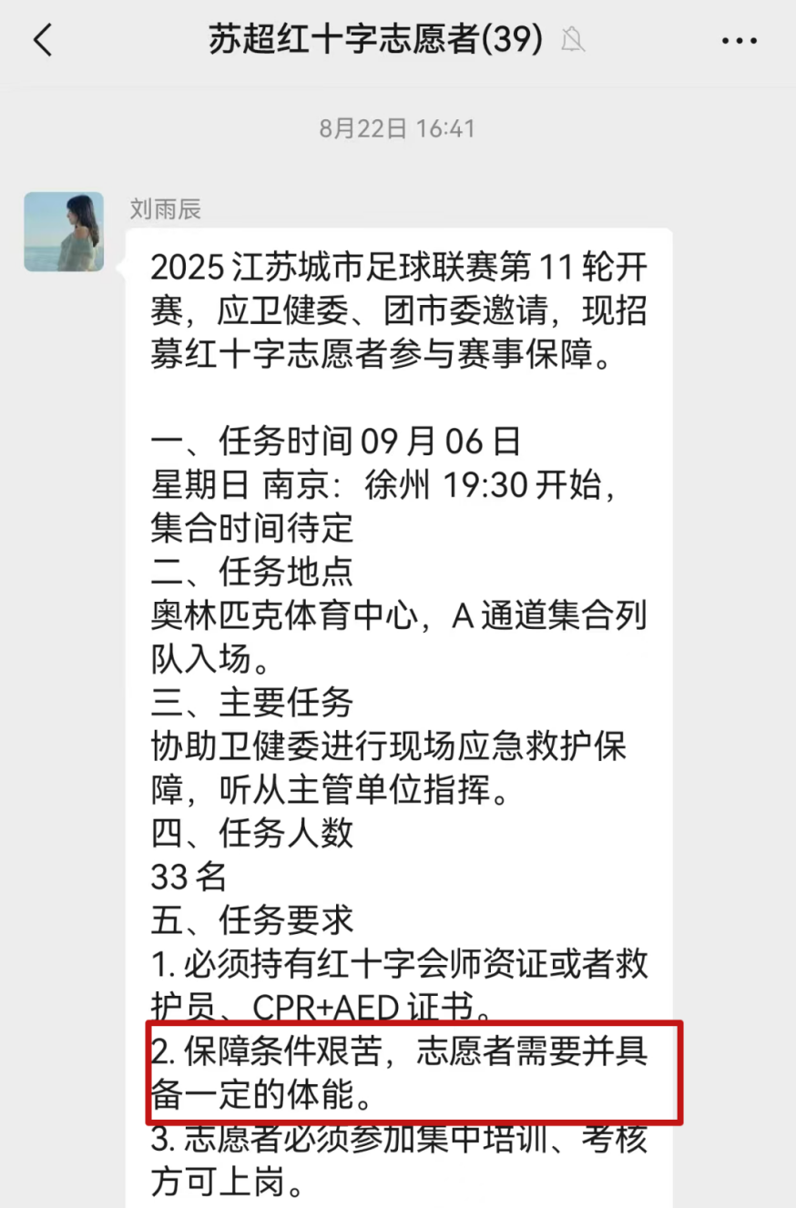 招募“苏超”志愿者的信息在群里一经发出,立刻收到热烈回应。比起在家吹空调,他们更愿意去参与保障,以尽自己所能去守护赛事安全为荣。
