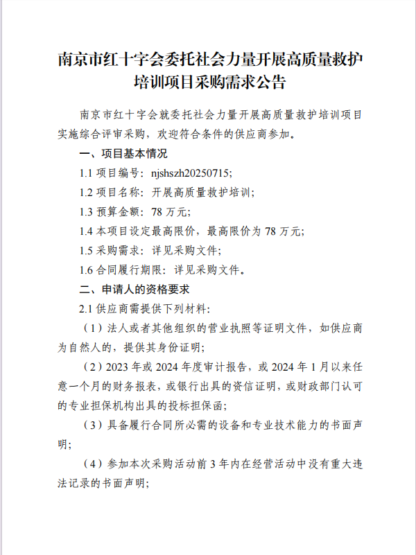 南京市红十字会开展高质量救护培训项目采购需求公告